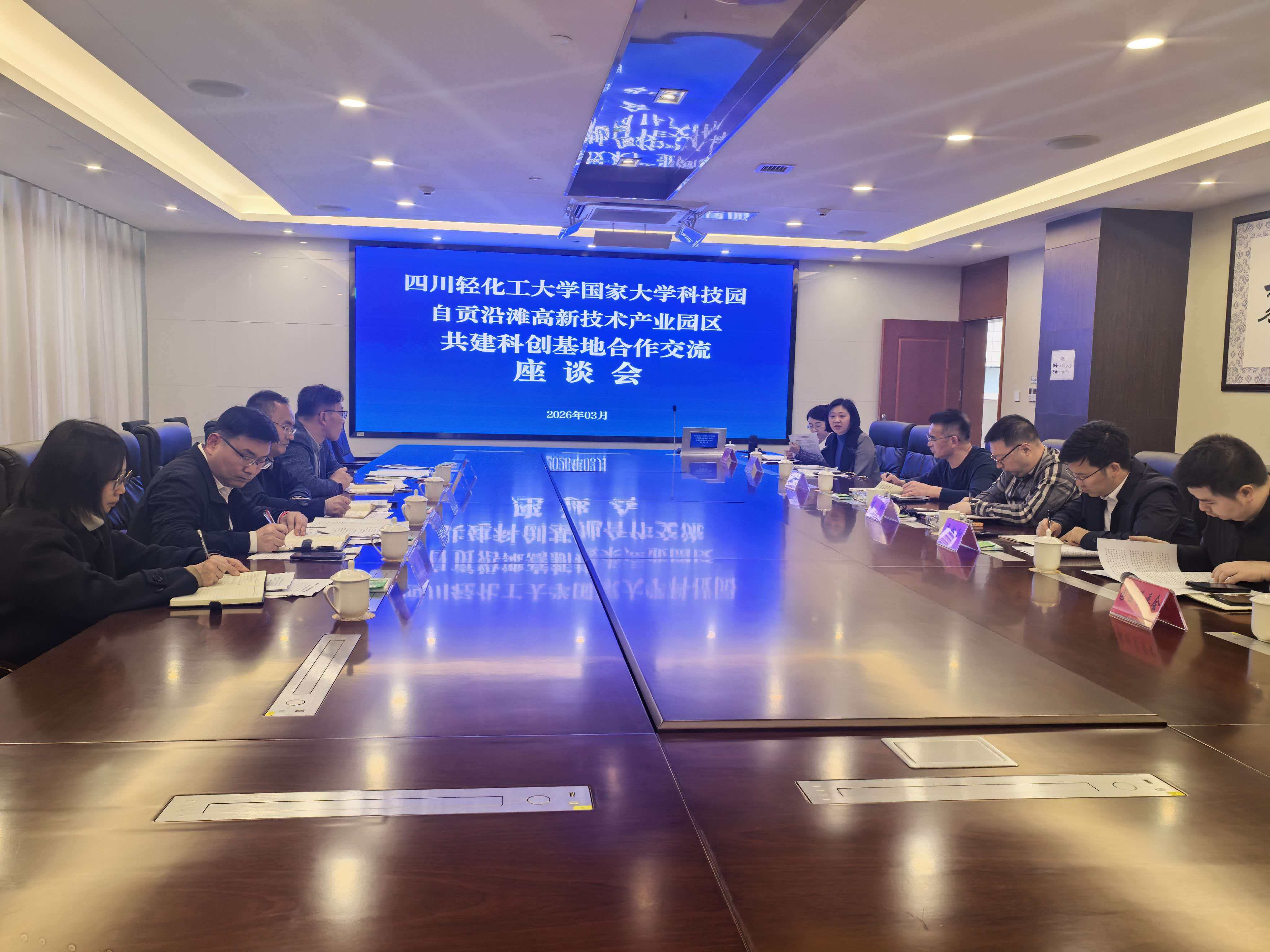 为共谋校地融合发展新路径,2026年3月25日,我校成果转化与教育服务中心(国家大学科技园管理办公室)副主任吴浩、刘强强(挂职)带队赴沿滩区,与沿滩区常委、常务副区长李钢,副区长李怀和,园区管委会、区科技与经信局、区投资促进局等相关负责人,就共建科创基地等合作事项进行座谈交流。